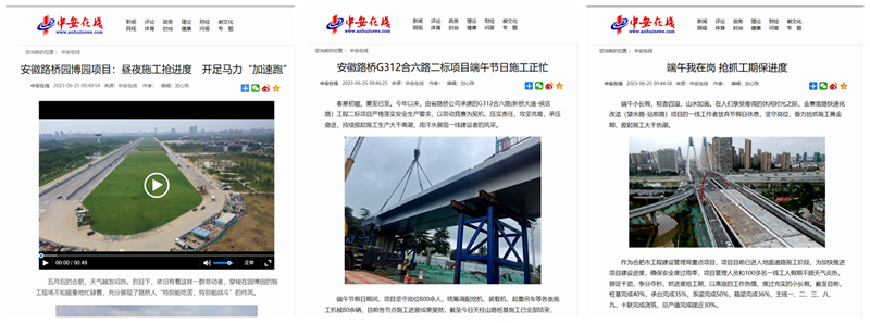 端午期間,中安在線、《合肥新聞聯(lián)播》等媒體聚焦公司園博園項目、G312合六路二標(biāo)、金寨南路快速化改造(望水路-站前路)等重點項目建設(shè),深度報道項目端午堅守崗位,奮力搶抓施工黃金期,掀起施工大干熱潮的建設(shè)情況。