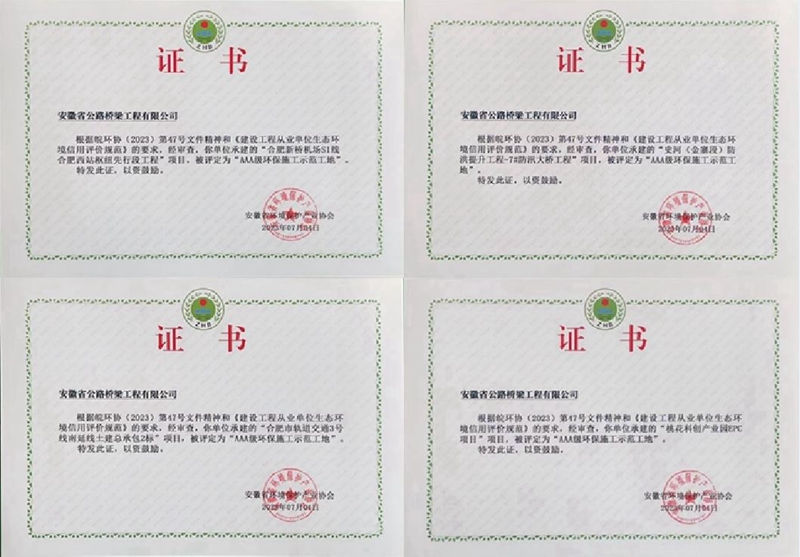 近日,公司承建的桃花科創(chuàng)產(chǎn)業(yè)園EPC項目、史河(金寨段)防洪提升工程-7#防汛大橋項目、合肥新橋機場S1線先行段項目、合肥軌道3號線南延2標(biāo)項目獲評安徽省環(huán)境保護(hù)產(chǎn)業(yè)協(xié)會“AAA級環(huán)保施工示范工地”稱號。