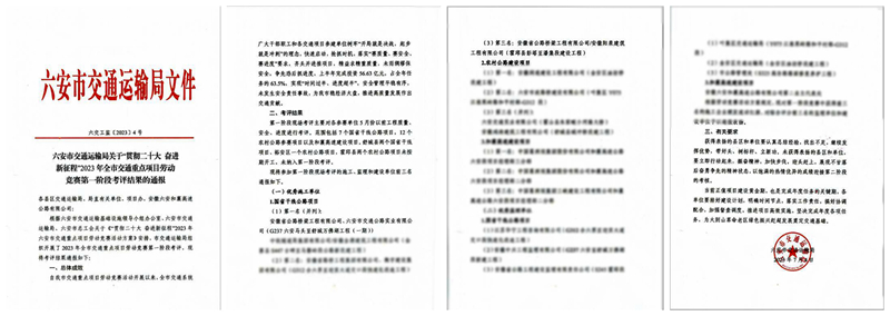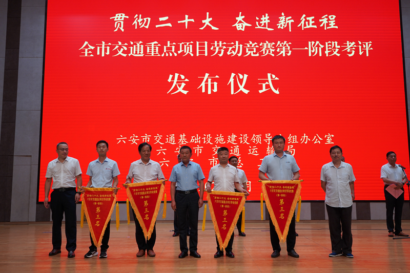7月15日,在六安市交通運輸基礎設施領導小組辦公室、市交通運輸局、市總工會聯(lián)合舉行的“貫徹二十大 奮進新征程”全市交通重點項目勞動競賽第一階段考評發(fā)布儀式上,公司承建的六安G237一期項目榮獲國省干線公路項目第一名、霍邱縣彭塔至潘集段建設工程榮獲第三名。