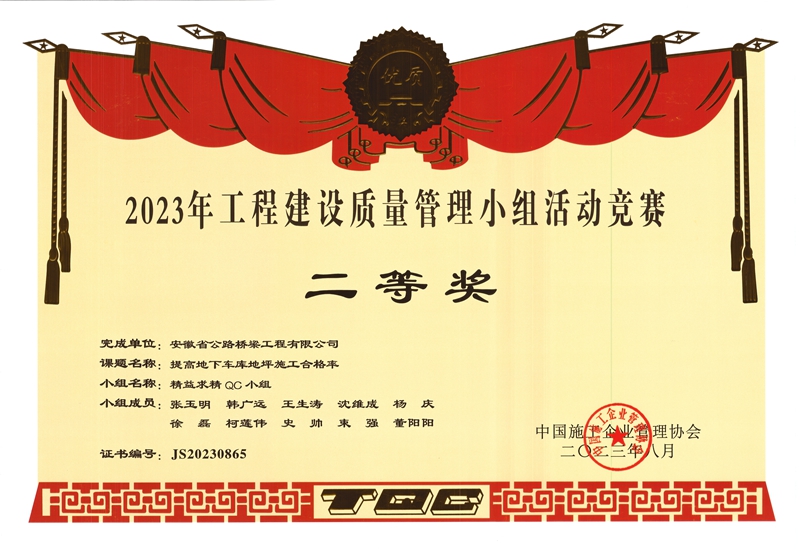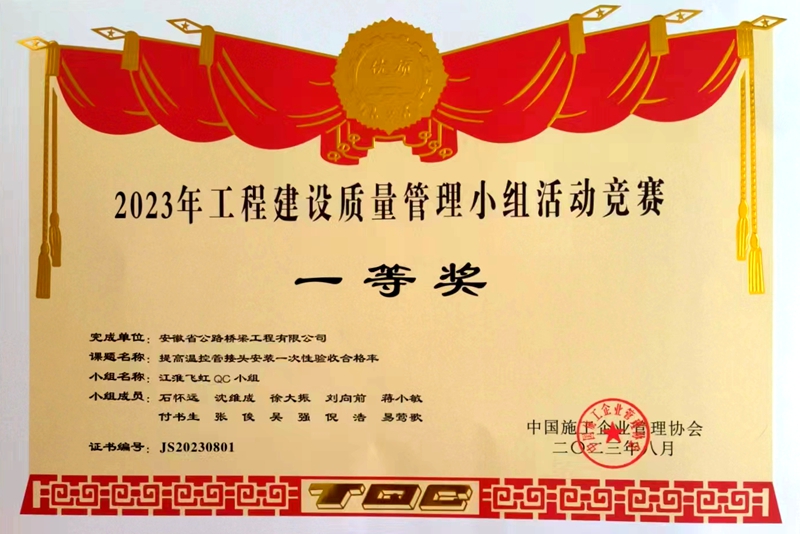 8月11日,中國施工企業(yè)管理協(xié)會“2023年(首屆)工程建設行業(yè)質量管理小組活動高質量發(fā)展大會”在山西太原順利閉幕。會議對各地區(qū)及行業(yè)協(xié)會推薦的1468個優(yōu)秀QC成果進行了集中發(fā)布,其中橋梁分公司申報的QC成果《提高溫控管接頭安裝一次性驗收合格率》榮獲一等獎,市政分公司申報的QC成果《提高地下車庫地坪施工合格率》《研制超大仿石道板磚鋪裝機》榮獲二等獎。