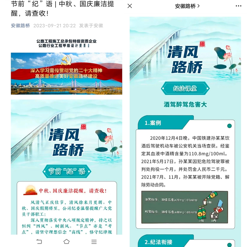 9月,公司陸續(xù)推出《紀(jì)法課堂|酒駕醉駕危害大》、《節(jié)前“紀(jì)”語|中秋、國慶廉潔提醒》,并組織學(xué)習(xí)中紀(jì)委、省紀(jì)委近期公開曝光的違反中央八項(xiàng)規(guī)定精神問題典型案例,向全體黨員干部發(fā)送廉潔過節(jié)提醒短信。中秋、國慶前,公司紀(jì)委通過微信公眾號、手機(jī)短信等形式密集推送廉潔提醒信息,重申節(jié)日紀(jì)律要求,做實(shí)作風(fēng)建設(shè)思想和紀(jì)律教育,早打招呼、早提醒。引導(dǎo)帶動各級黨組織通過“三會一課”、主題黨日等,把全面從嚴(yán)治黨、加強(qiáng)節(jié)點(diǎn)作風(fēng)建設(shè)要求傳達(dá)到每一名黨員干部。市政分公司組織赴包公故里文化園開展“筑防線葆廉潔本色 揚(yáng)正氣創(chuàng)清風(fēng)路橋”主題黨日活動;橋梁分公司、軌道分公司逐級對關(guān)鍵崗位人員開展廉潔從業(yè)談心談話,持續(xù)提高黨員干部紀(jì)律規(guī)矩意識。時刻繃緊紀(jì)律規(guī)矩之弦,對標(biāo)作風(fēng)建設(shè)紀(jì)律規(guī)矩檢視律己,守紀(jì)律、知敬畏、過“廉”節(jié)。