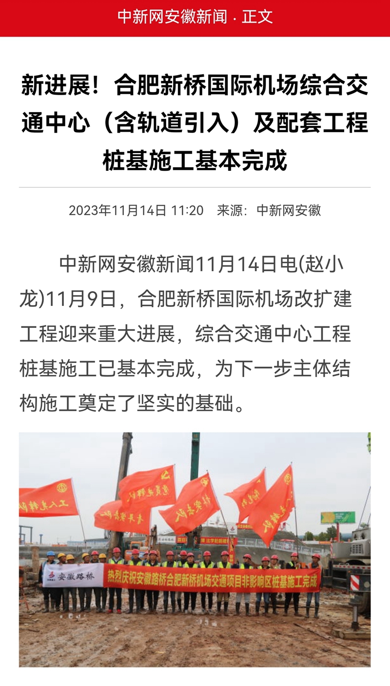 近日,公司承建的合肥新橋國際機(jī)場改擴(kuò)建項(xiàng)目迎來新進(jìn)展,綜合交通中心工程樁基施工完成,為下一步展開主體結(jié)構(gòu)建設(shè)奠定堅(jiān)實(shí)基礎(chǔ)。央視網(wǎng)、中新網(wǎng)、中國建設(shè)報(bào)、安徽交通廣播、合肥日報(bào)、合肥新聞等多家中央和省市級(jí)主流媒體持續(xù)關(guān)注報(bào)道。