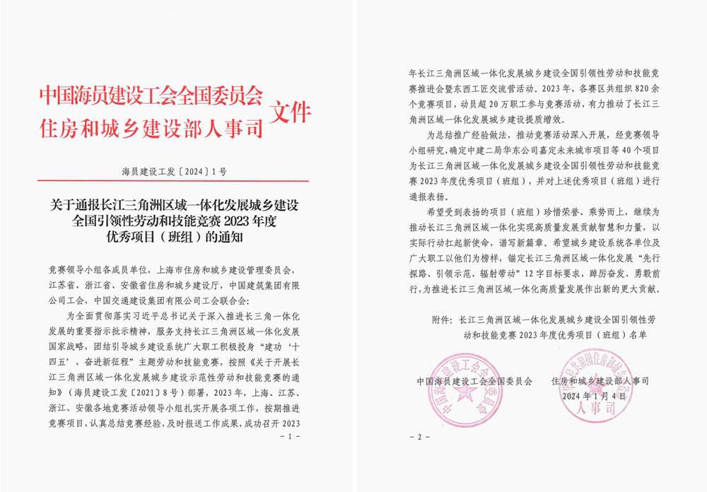 近日,中國(guó)海員建設(shè)工會(huì)和住建部人事司聯(lián)合公布長(zhǎng)江三角洲區(qū)域一體化發(fā)展城鄉(xiāng)建設(shè)全國(guó)引領(lǐng)性勞動(dòng)和技能競(jìng)賽2023年度優(yōu)秀項(xiàng)目評(píng)選結(jié)果,公司桃花科創(chuàng)產(chǎn)業(yè)園EPC項(xiàng)目榜上有名。