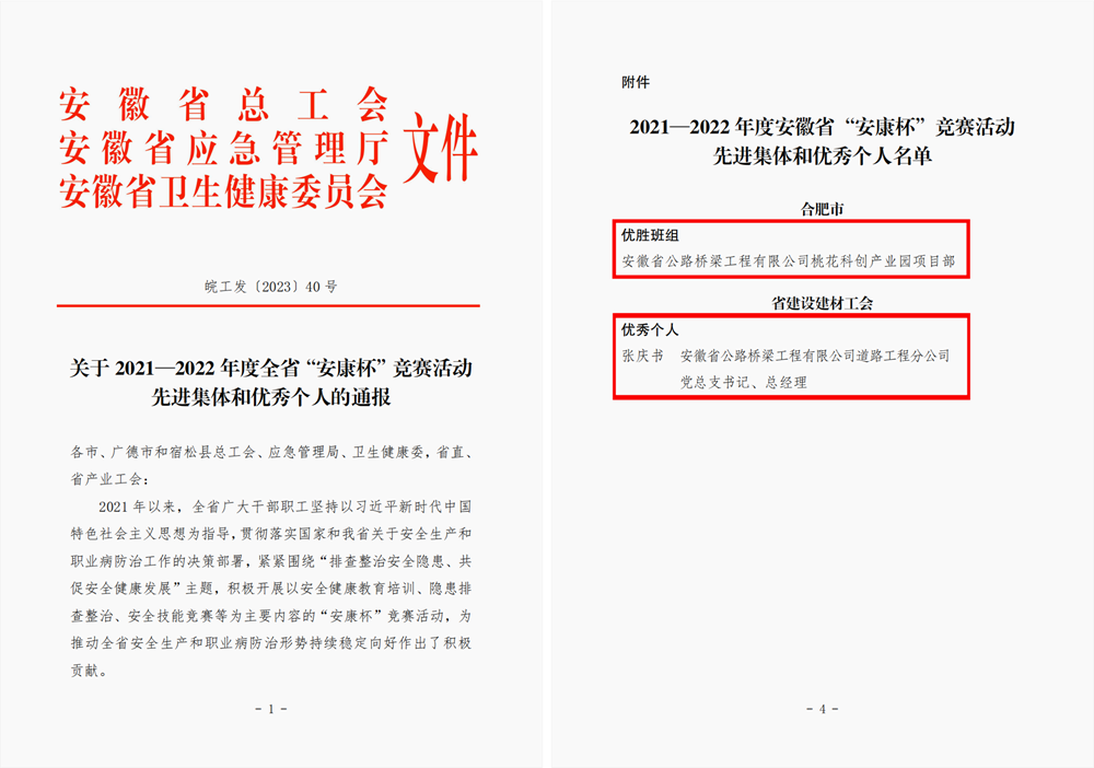 近日,安徽省總工會、安徽省應(yīng)急管理廳、安徽省衛(wèi)生健康委員會印發(fā)《關(guān)于2021-2022年度全省“安康杯”競賽活動先進(jìn)集體和優(yōu)秀個人的通報》,市政分公司桃花科創(chuàng)產(chǎn)業(yè)園項目部獲評“優(yōu)勝班組”,道路分公司黨總支書記、總經(jīng)理張慶書獲評“優(yōu)秀個人”。