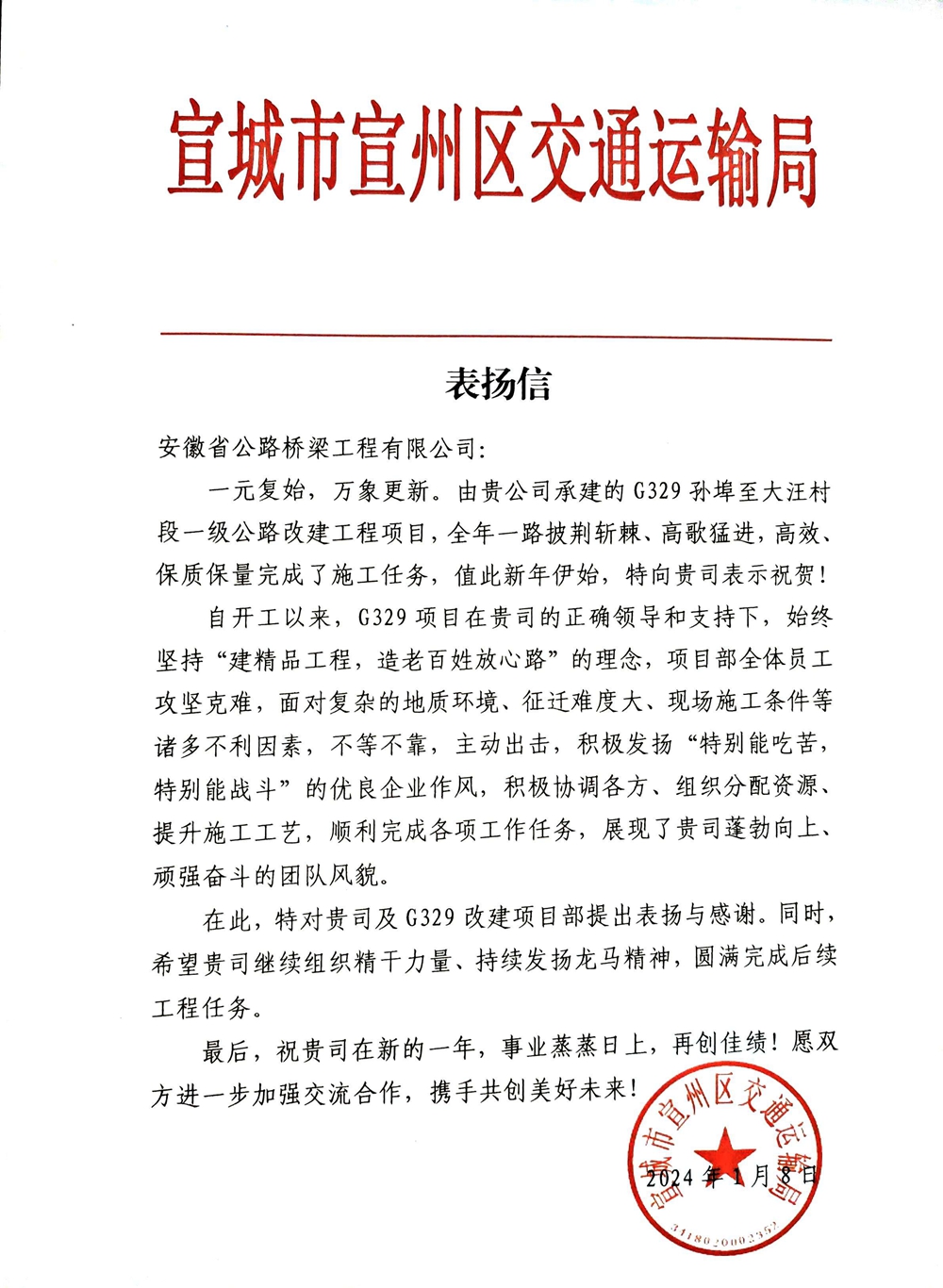 宣城市宣州區(qū)交通運(yùn)輸局來(lái)信指出,G329孫埠至大汪村段一級(jí)公路改建工程項(xiàng)目始終堅(jiān)持“建精品工程,造百姓放心路”的理念,克服地質(zhì)環(huán)境復(fù)雜、征遷難度大、施工條件差等諸多不利因素,積極協(xié)調(diào)各方,順利完成各項(xiàng)工作任務(wù),展現(xiàn)了項(xiàng)目團(tuán)隊(duì)頑強(qiáng)奮斗的精神風(fēng)貌。
