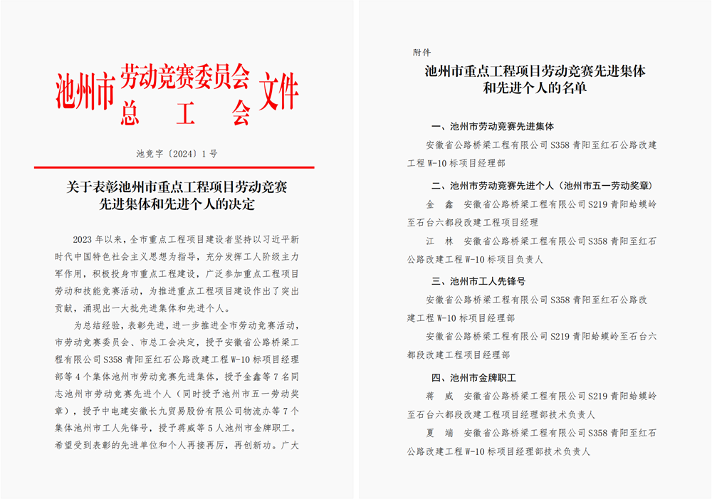 近日,池州市勞動(dòng)競(jìng)賽委員會(huì)、市總工會(huì)印發(fā)《關(guān)于表彰池州市重點(diǎn)工程項(xiàng)目勞動(dòng)競(jìng)賽先進(jìn)集體和先進(jìn)個(gè)人的決定》,公司所屬S358青陽至紅石公路改建工程W10標(biāo)項(xiàng)目經(jīng)理部獲評(píng)“市勞動(dòng)競(jìng)賽先進(jìn)集體”,金鑫、江林兩名同志獲評(píng)“市勞動(dòng)競(jìng)賽先進(jìn)個(gè)人”,同時(shí)授予池州市五一勞動(dòng)獎(jiǎng)?wù)拢籗358改建W10標(biāo)、S219青陽改建兩個(gè)項(xiàng)目獲評(píng)“市工人先鋒號(hào)”,蔣威、夏端兩名同志獲評(píng)池州市“金牌職工”。