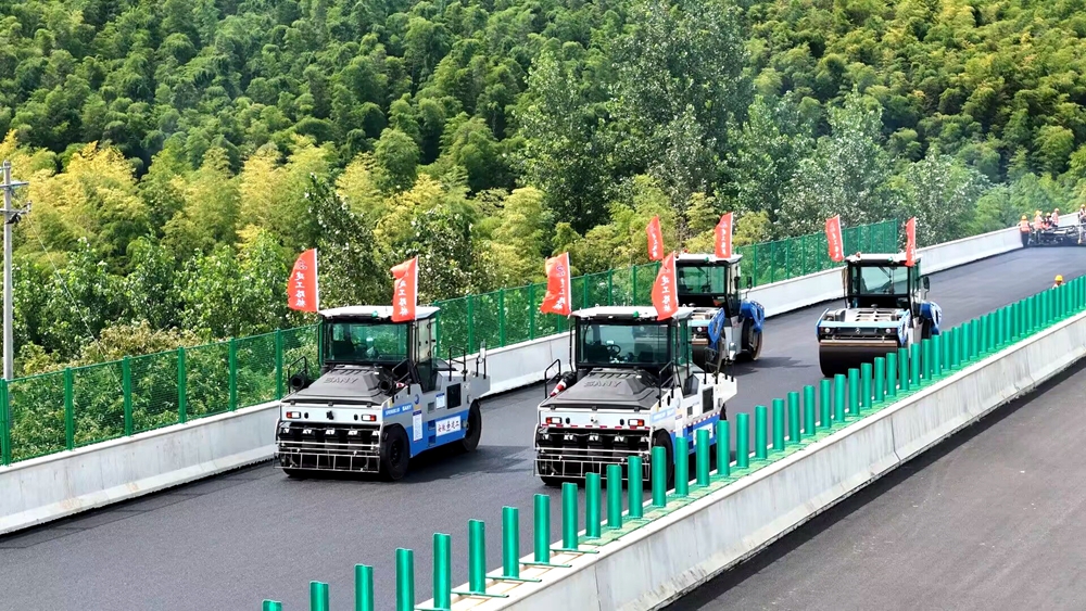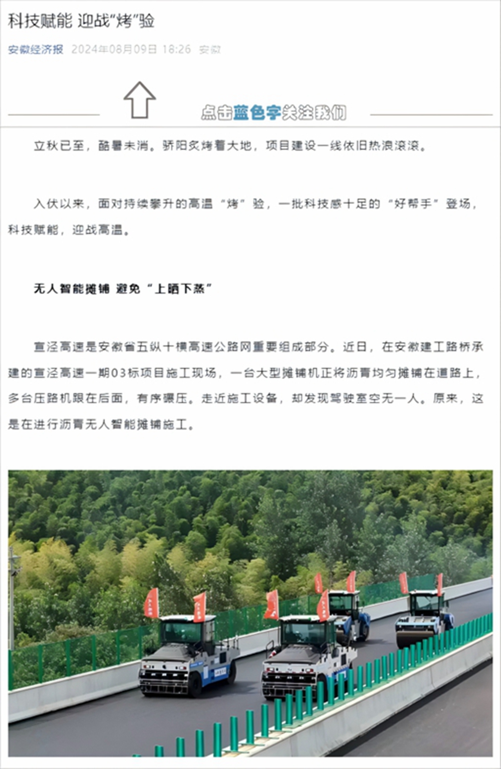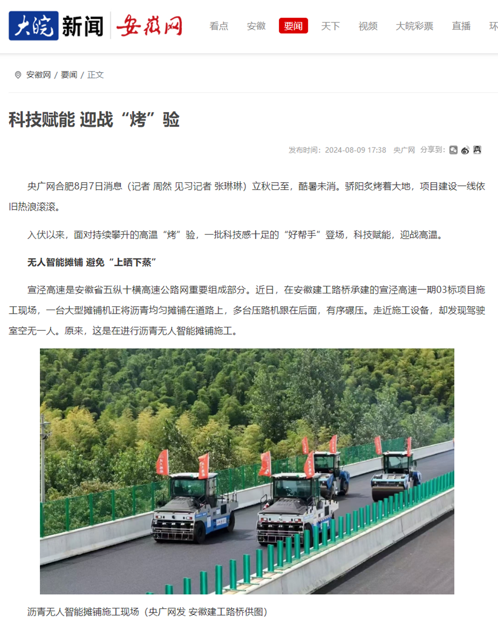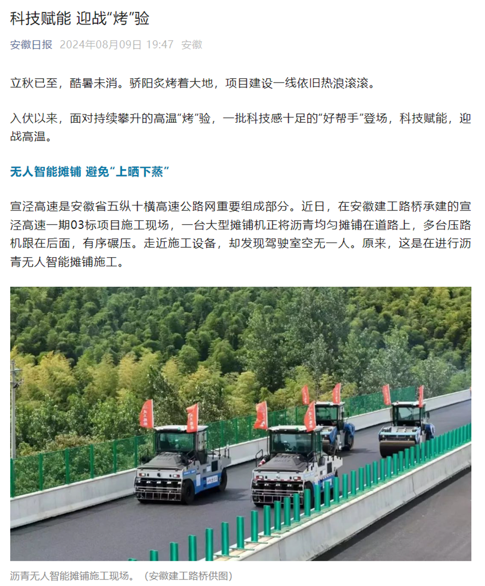 宣涇高速是安徽省五縱十橫高速公路網(wǎng)重要組成部分。近日,在安徽建工路橋承建的宣涇高速一期03標(biāo)項(xiàng)目施工現(xiàn)場(chǎng),一臺(tái)大型攤鋪機(jī)正將瀝青均勻攤鋪在道路上,多臺(tái)壓路機(jī)跟在后面,有序碾壓。走近施工設(shè)備,卻發(fā)現(xiàn)駕駛室空無(wú)一人。原來(lái),這是在進(jìn)行瀝青無(wú)人智能攤鋪施工。