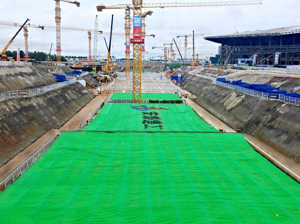 灼灼烈日,人們出行會(huì)打起遮陽(yáng)傘躲避烈日與紫外線侵襲。近日,在合肥新橋機(jī)場(chǎng)綜合交通中心項(xiàng)目現(xiàn)場(chǎng),一項(xiàng)防暑“神器”——大跨度、智能化防塵“天幕”系統(tǒng)投入使用,如同給項(xiàng)目基坑罩上了一把“綠色遮陽(yáng)傘”。