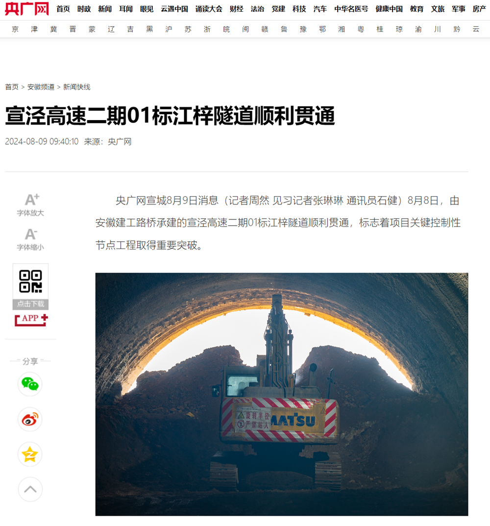 【名媒聚焦】央廣網(wǎng)、中安在線、宣城發(fā)布:宣涇高速二期01標(biāo)江梓隧道順利貫通