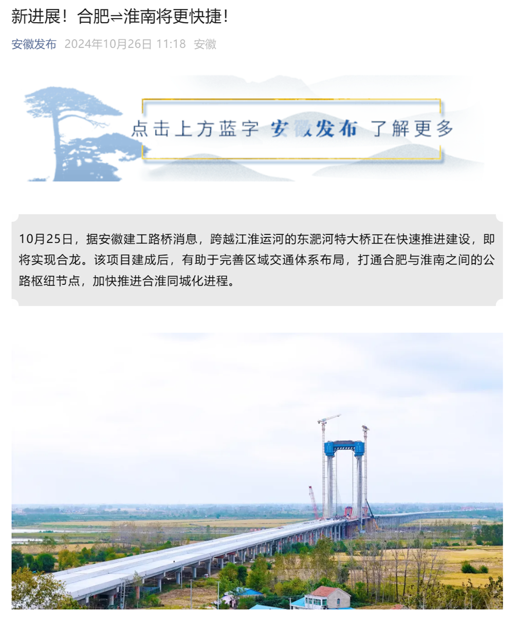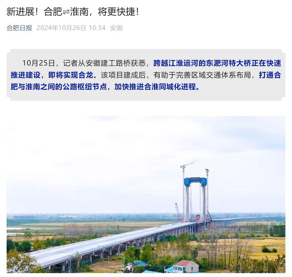 【名媒聚焦】安徽發(fā)布、合肥日報、淮河早報等主流媒體持續(xù)聚焦東淝河特大橋建設(shè)