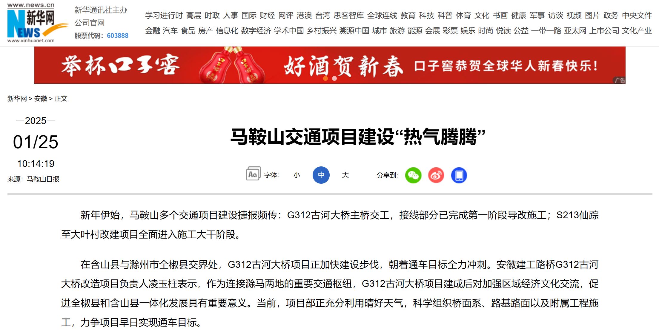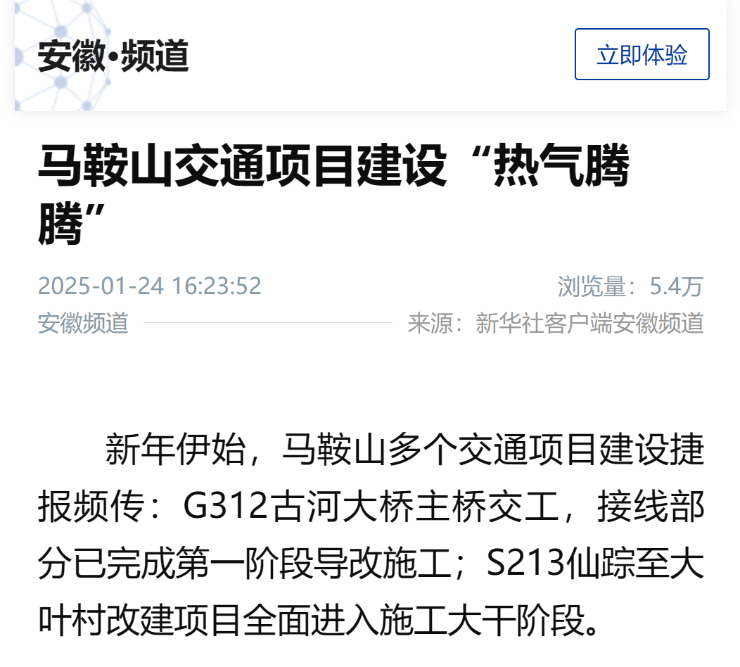 新年伊始,馬鞍山多個(gè)交通項(xiàng)目建設(shè)捷報(bào)頻傳:G312古河大橋主橋交工,接線部分已完成第一階段導(dǎo)改施工;S213仙蹤至大葉村改建項(xiàng)目全面進(jìn)入施工大干階段。