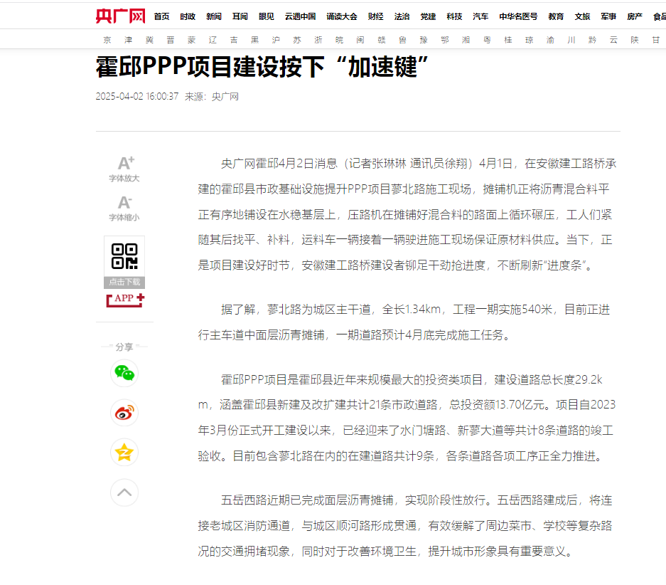 【名媒聚焦】央廣網(wǎng)、安徽日報:安徽建工路橋霍邱PPP項目建設按下“加速鍵”