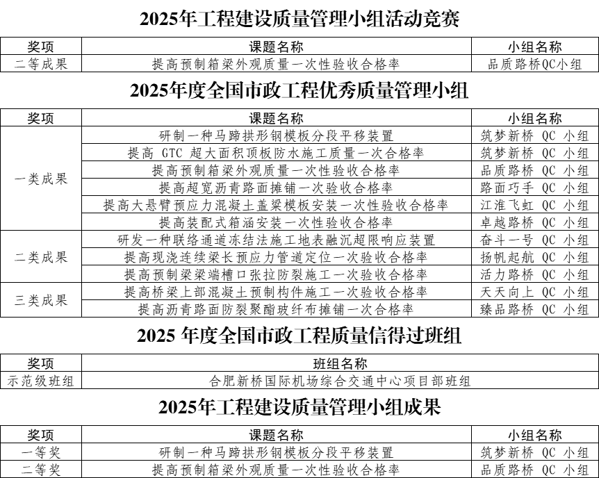 近日,中國市政工程協(xié)會、中國建筑業(yè)協(xié)會、中國施工企業(yè)管理協(xié)會先后公布2025年度質量管理小組及班組活動成果大賽評選結果,公司共斬獲15項國家級獎項。