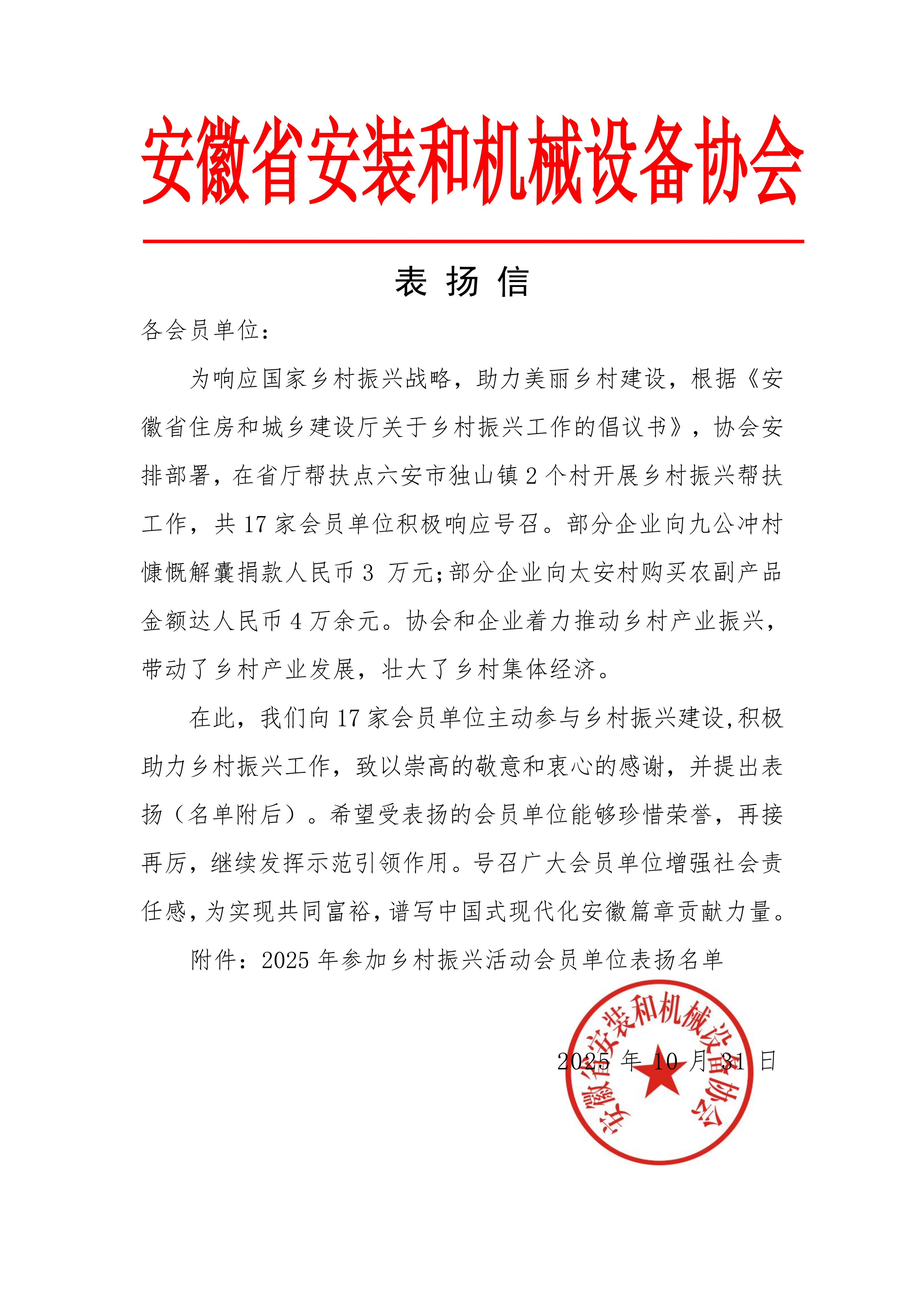 公司積極響應(yīng)國家鄉(xiāng)村振興戰(zhàn)略,助力美麗鄉(xiāng)村建設(shè),根據(jù)《安徽省住房和城鄉(xiāng)建設(shè)廳關(guān)于鄉(xiāng)村振興工作的倡議書》,協(xié)會安排部署,著力推動鄉(xiāng)村產(chǎn)業(yè)振興,帶動了鄉(xiāng)村產(chǎn)業(yè)發(fā)展,壯大了鄉(xiāng)村集體經(jīng)濟(jì)。——安徽省安裝和機(jī)械設(shè)備協(xié)會