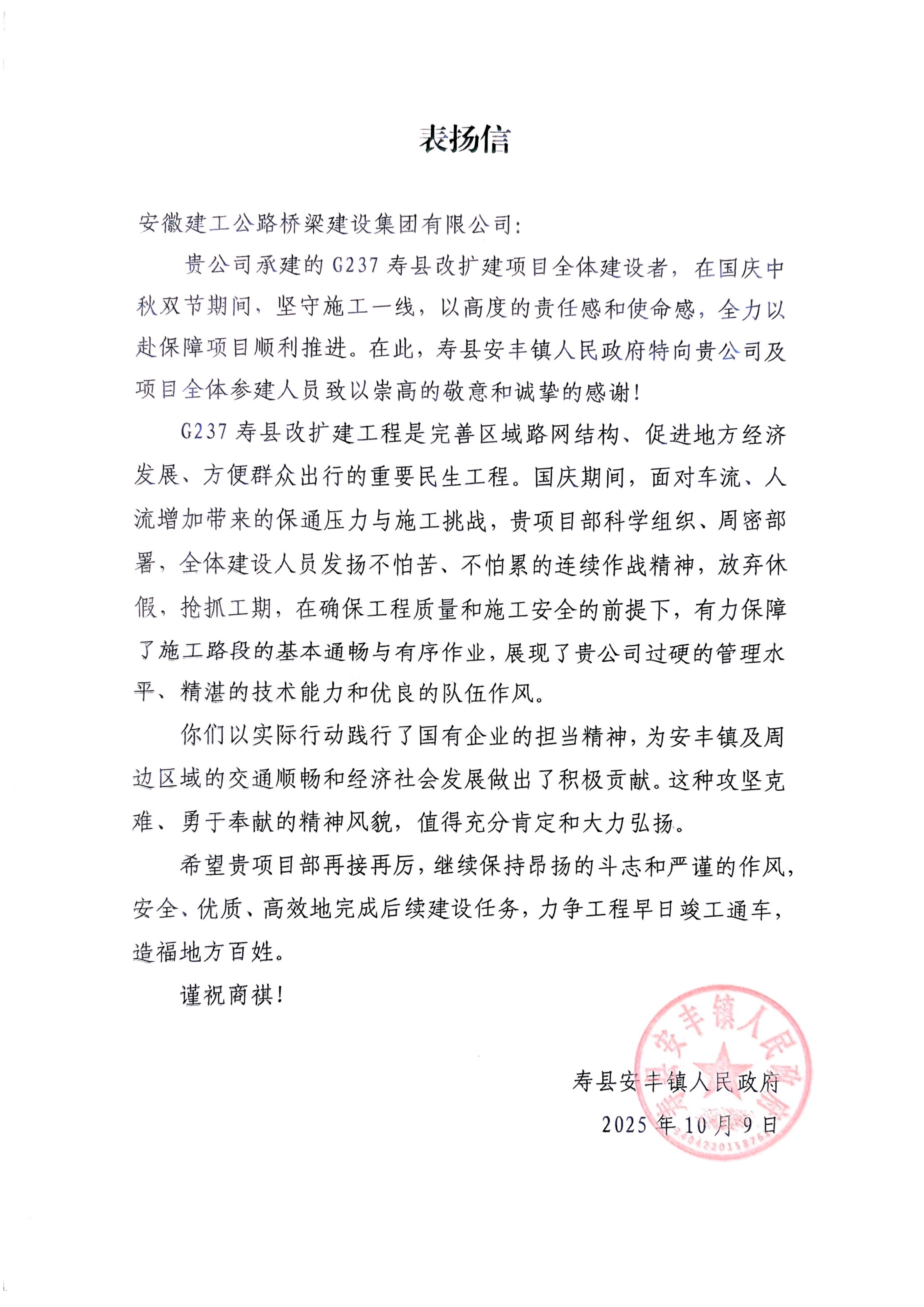 公司承建的G237壽縣改擴(kuò)建項(xiàng)目全體建設(shè)者,在國慶中秋雙節(jié)期間,堅(jiān)守施工一線,以高度的責(zé)任感和使命感,全力以赴保障項(xiàng)目順利推進(jìn)。為安豐鎮(zhèn)及周邊區(qū)域的交通順暢和經(jīng)濟(jì)社會發(fā)展做出了積極貢獻(xiàn)。——壽縣安豐鎮(zhèn)人民政府