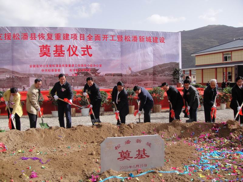 安徽省駐松援建辦主任孔曉宏首先介紹了開工項目情況,松潘縣委書記、縣人大常委會主任黃芝林致辭發(fā)言,施工單位、監(jiān)理單位代表分別作了發(fā)言。阿壩州州長吳澤剛、安徽省省長助理、省對口援建辦主任梁衛(wèi)國也先后作了重要講話。最后,安徽省人大副主任朱先發(fā)宣布安徽省對口援建松潘縣恢復(fù)重建項目全面開工,安徽省、四川省、阿壩州、松潘縣領(lǐng)導(dǎo)在隆隆的禮炮聲中為松潘新城建設(shè)開挖了第一鍬土。