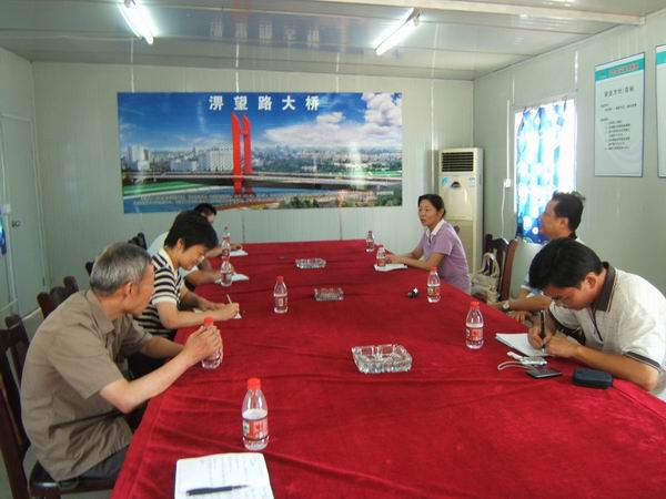 在項目部會議室,李主席等領(lǐng)導(dǎo)仔細(xì)聽取項目經(jīng)理江仲明的介紹,不時關(guān)切地詢問工程相關(guān)情況。工會主席趙其榮向集團工會李主席等一行在高溫天氣下來公司淠望路大橋項目部慰問表示感謝。