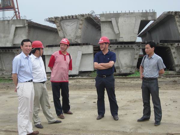 在泗泗01標,戴總一行首先在項目部會議室聽取了由項目經(jīng)理江仲明所做的關(guān)于泗泗01標工程建設、施工進度、安全文明建設、規(guī)范化管理等方面的詳細匯報。在聽取匯報過程中,戴總等領導就安全管理、文明施工、標準化工地建設方面與項目經(jīng)理及總工進行了深入的交流,并給予了切實可行的指導意見。會后,戴總一行來到該標的預制梁場進行了實地檢查,主要對施工現(xiàn)場的蓋梁骨架、箱梁澆筑與養(yǎng)生、施工用電、施工機具、安全生產(chǎn)宣傳以及文明施工情況進行了詳細的檢查。并就該標箱梁預制所采用的后張拉技術(shù)與項目總工石懷遠進行了深層次的交流。在檢查結(jié)束后,集團領導對此次的檢查結(jié)果作了總結(jié)。戴總對該標開工以來所取得的成績,以及在質(zhì)量、安全文明施工與項目管理方面所做的工作給予了充分肯定,同時他強調(diào):安全是生產(chǎn)的保障,文明是素質(zhì)的體現(xiàn),質(zhì)量是建設的關(guān)鍵,必須以“深入貫徹安全文明生產(chǎn)”為核心,要以強化安全意識、提高安全文明素質(zhì)為著力點,切實加強安全文明示范工地建設,建設優(yōu)質(zhì)工程。