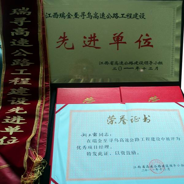 公司承建的瑞尋A7標在公司的正確領(lǐng)導(dǎo)下,在以劉大雷同志為首的項目全體員工的共同奮斗下,經(jīng)過兩年的頑強拼搏、艱苦施工,終于實現(xiàn)了瑞尋高速公路的建成通車,在贛南大地描繪了一條絢麗的彩虹,書寫了一幅質(zhì)優(yōu)、安全、廉潔、環(huán)保的壯麗畫卷。瑞尋A7標以工程質(zhì)量更優(yōu)、外觀形象更美、生態(tài)環(huán)境更佳、依法管理更嚴、安全廉潔更好為要求,以抓細節(jié)、樹精品、講程序、促規(guī)范、善創(chuàng)新、爭一流為管理理念,取得了一系列的優(yōu)異成績。在項目辦的兩次階段評比中均獲得A段第一,全線第二名的好成績,還獲得了業(yè)主頒布的“先進單位”稱號,項目經(jīng)理劉大雷獲得了瑞尋項目“優(yōu)秀項目經(jīng)理”稱號,項目總工戴聲慶、副經(jīng)理鳳爾飛、王星輝和黃明明四人獲得了“先進個人”稱號。
