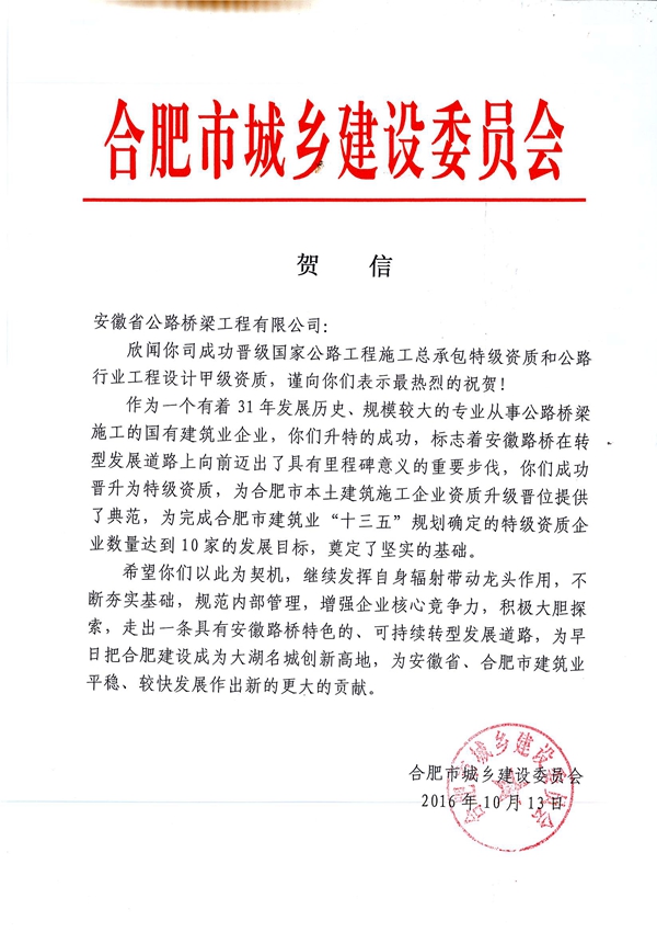 近日,合肥市城鄉(xiāng)建設(shè)委員會(huì)向公司發(fā)來(lái)賀信,熱烈祝賀公司晉升國(guó)家公路工程施工總承包特級(jí)資質(zhì)和公路行業(yè)工程設(shè)計(jì)甲級(jí)資質(zhì)。
