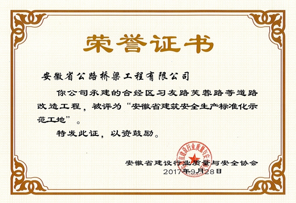 這是公司自去年開全省市政路橋工程先河,一次性獲得五個(gè)省級(jí)安全標(biāo)準(zhǔn)化示范工地后,再次獲得這一榮譽(yù)。