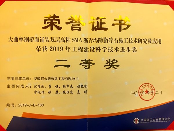 近日,2019年中國施工企業(yè)管理協(xié)會工程建設(shè)科學(xué)技術(shù)獎勵大會在天津召開,公司主持的課題成果“大曲率鋼橋面鋪裝雙層高粘SMA瀝青瑪蹄脂碎石施工技術(shù)”經(jīng)過專家評審,榮獲二等獎。