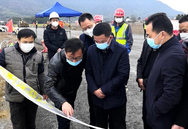3月1日下午,安徽省交通運輸廳總工程師章后忠一行到公司承建的涇縣208省道延伸段調研防疫和復工工作,涇縣副縣長程禮奎、交通運輸局局長曹建華等陪同。
