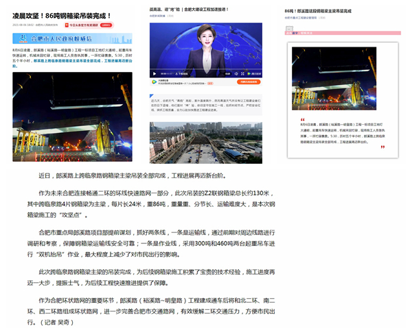 近日,人民網(wǎng)安徽頻道、合肥市廣播電視臺(tái)、合肥市人民政府等多家省市級(jí)主流媒體相繼報(bào)道了公司承建的郎溪路(裕溪路—明皇路)01標(biāo)項(xiàng)目建設(shè)情況。
