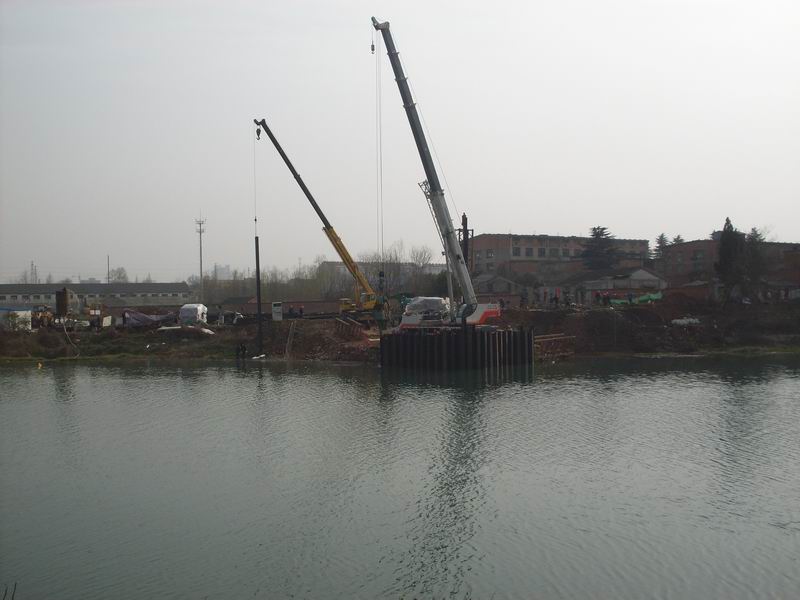 淠望路大橋作為市政工程具有工期緊、任務重、技術難度大的特點,但經(jīng)項目部領導精心組織、科學部署,加大人力與設備的投入,自2月1日進場開工以來,全部90根挖孔樁已開挖41根,累計深度270m;于2月18日開始進行關鍵工序——主墩右幅鋼板樁圍堰施工。由于淠史杭干渠承擔皖豫兩省14個縣(區(qū))的春耕灌溉任務,六安市重點辦要求加快施工進度,必須在4月15日完成所有水下工程及用于水面以上施工的支撐等,并于4月25日前完成圍堰拆除清理工作。項目部立即召開緊急動員會,號召全體技術人員克服一切困難和挑戰(zhàn),堅決完成上級交代的任務,并立即組織技術人員根據(jù)鋼板樁長度、水深、地質(zhì)、承臺埋置深度等情況,制定了科學的施工技術方案、成立了以項目部經(jīng)理、副經(jīng)理為組長的安全領導小組。施工所用的T90振動錘、70t吊車、25t吊車、PC200挖機、 T100推土機、ZLM50裝載機、自卸車等重型機械設備陸續(xù)開進施工現(xiàn)場。