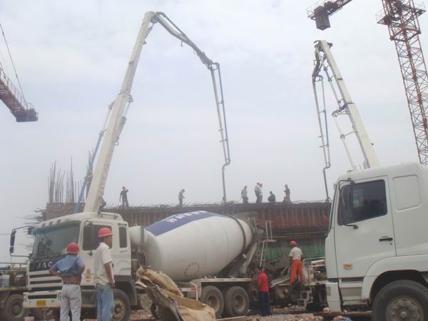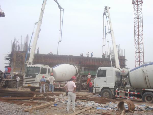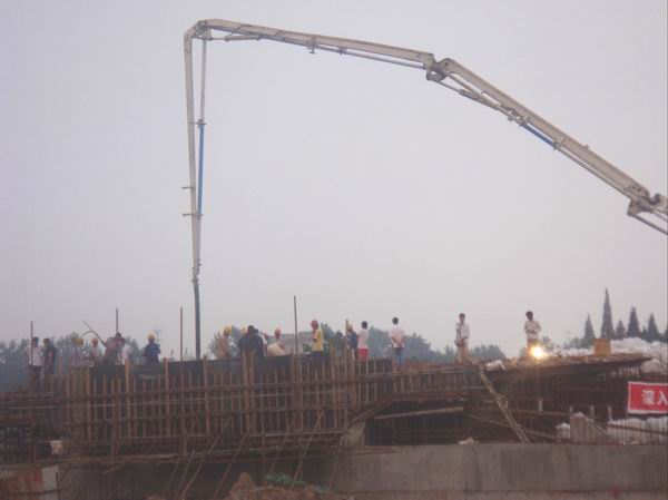 盛夏季節(jié),驕陽似火。經(jīng)項目部科學組織、精心準備、合理安排,2009年6月21日上午六安市淠望路大橋工地上人頭攢動、機器轟鳴,兩臺混凝土泵車高高聳立在大橋主墩0#塊上面。九時許,經(jīng)現(xiàn)場監(jiān)理組和業(yè)主驗收后,淠望路大橋主墩0#塊開始澆注混凝土,現(xiàn)場施工人員克服高溫酷暑天氣,經(jīng)過個5個多小時的連續(xù)奮戰(zhàn),于當天下午三點順利完成混凝土的澆筑工作。