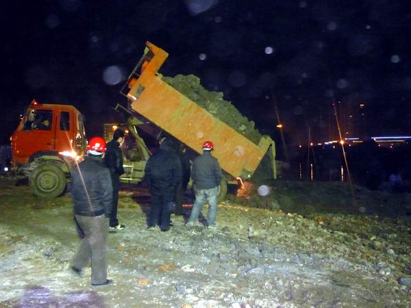 當(dāng)1219日,宋斗灣路完成第一根樁(位于南淝河北側(cè),屬于3#橋臺)的開挖澆注工作后,項目經(jīng)理部就開始籌劃南淝河南側(cè)的筑島圍堰工作。1224日,當(dāng)3#橋臺的六根樁全部澆注完成后,當(dāng)天晚上仍繼續(xù)前一晚的筑島工作。每次筑島時,現(xiàn)場橋梁技術(shù)員、測量技術(shù)員和安全員都和工人們一起奮戰(zhàn),而每次奮戰(zhàn)都是一個通宵。截至25日,南淝河筑島圍堰共計用土近270車,約4600方,筑島面積和筑島深度達到預(yù)案和監(jiān)理要求,符合現(xiàn)場施工的實際要求。至此,筑島圍堰工作圓滿完成。