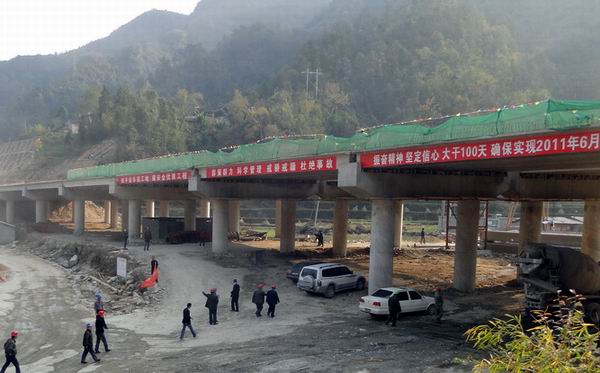王家溝大橋設計為8孔20米,橋梁全長170.08米,共8跨28根立柱,144塊梁板,上部構造為20米跨徑預應力空心板,下部構造橋墩為柱式敦、樁基礎,橋臺為u型臺擴基、柱式臺樁基。從2009年12月份開始樁基挖空施工,克服了挖孔巖石堅硬、反復滲水的地質困難,經(jīng)受住7月15日特大洪水和8月6日龍卷風考驗,順利于6月份完成立柱施工,8月開始進行橋臺施工,9月6日開始梁板架設。在梁板架設的同時,橋面連接施工也已經(jīng)展開,截止11月8日,橋面連接施工只剩下最后一跨。