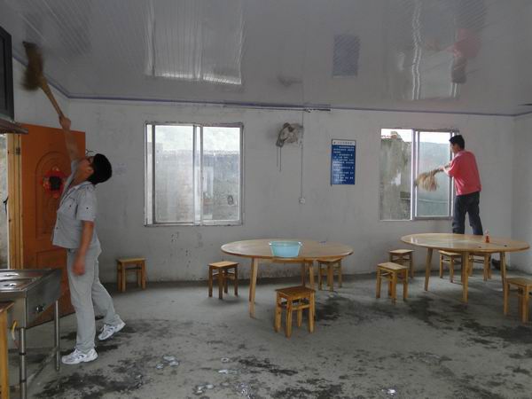 下午5點,按照先前的分工,各部門的團(tuán)員都積極行動起來。試驗室負(fù)責(zé)餐廳生活區(qū),工程部、質(zhì)檢部負(fù)責(zé)宿舍樓,其余部門負(fù)責(zé)辦公走廊及前場活動區(qū)域的衛(wèi)生打掃。清洗桌子,擦洗門窗、打掃走廊,清理枯枝敗葉,經(jīng)過兩小時的辛勤勞動,整個項目部煥然一新。