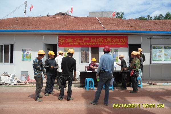 上午10時(shí)半左右,贛州高速公司安監(jiān)辦劉主任、項(xiàng)目辦綜合處李處長等業(yè)主單位領(lǐng)導(dǎo)來我標(biāo)段現(xiàn)場,指導(dǎo)檢查安全月咨詢活動(dòng)開展情況,并接受現(xiàn)場工人有關(guān)安全生產(chǎn)知識(shí)的咨詢。在對(duì)我標(biāo)段安全生產(chǎn)月咨詢活動(dòng)開展情況表示贊許的同時(shí),劉主任一行也提出了要求,希望我部采取多種形式開展安全生產(chǎn)宣傳教育工作,使一線工人明確自己的權(quán)利、義務(wù),掌握施工安全知識(shí)和技能。